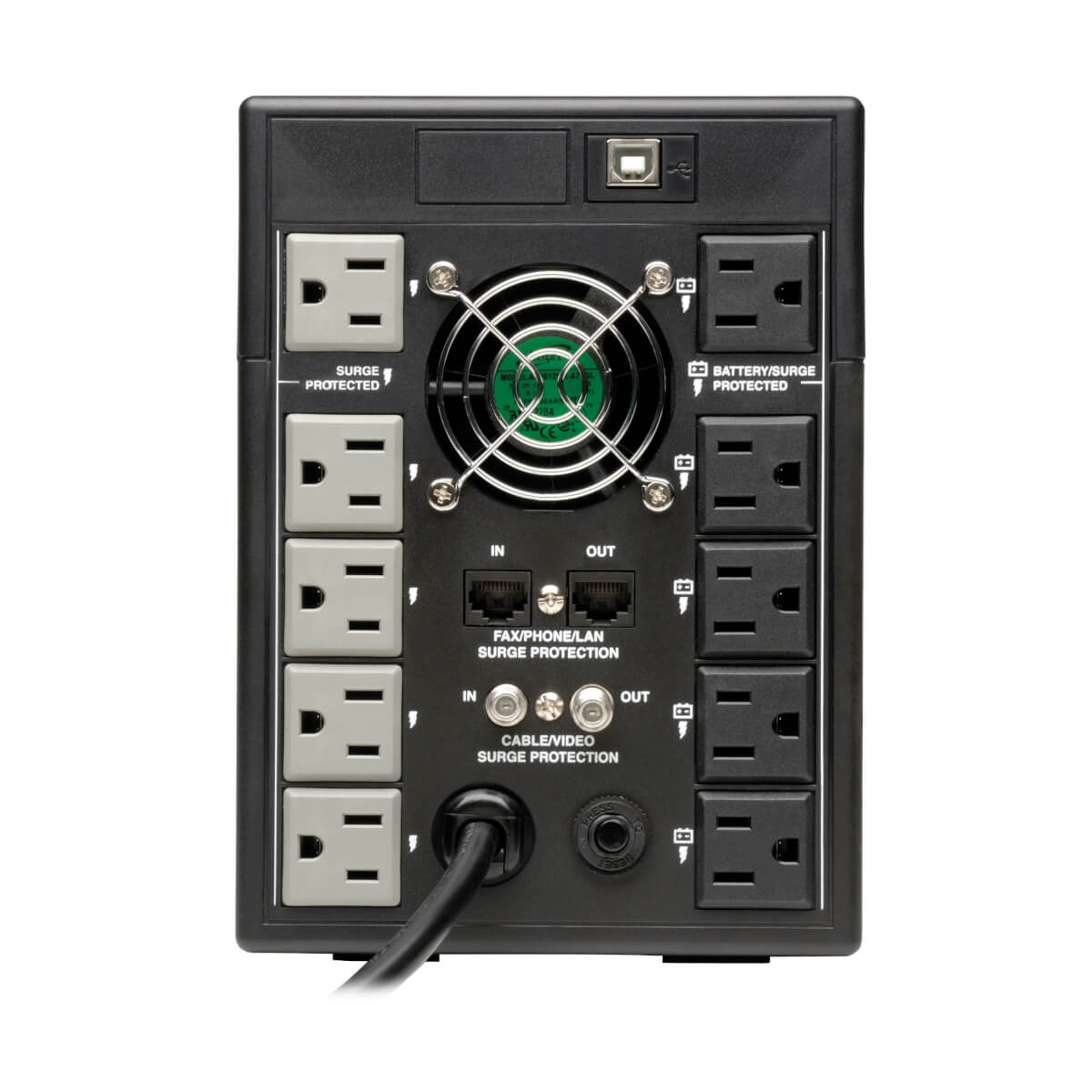 Diez tomacorrientes 5-15R alimentan al equipo conectado con una salida de CA de onda sinusoidal pura. La energía provista por estos tomacorrientes está filtrada para proteger a los equipos conectados contra las dañinas sobretensiones y ruidos en la línea Cinco tomacorrientes ofrecen además soporte de respaldo por batería para permitirle tiempo para guardar archivos críticos y llevar a cabo el apagado seguro de equipo vital, como computadoras, monitores y discos duros externos.