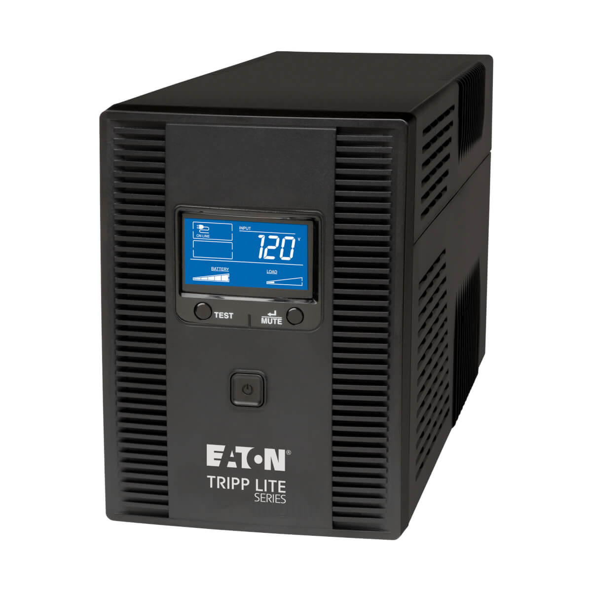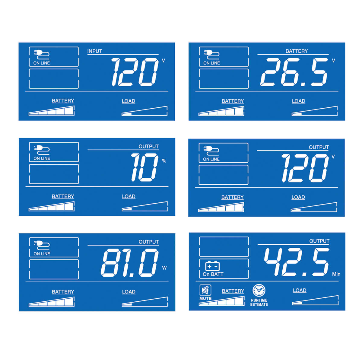 La gran pantalla LCD indica diversas condiciones de funcionamiento del UPS, como voltaje, autonomía, carga, batería y modo de operación. Una alarma acústica indica la perdida de energía de la red pública o batería baja